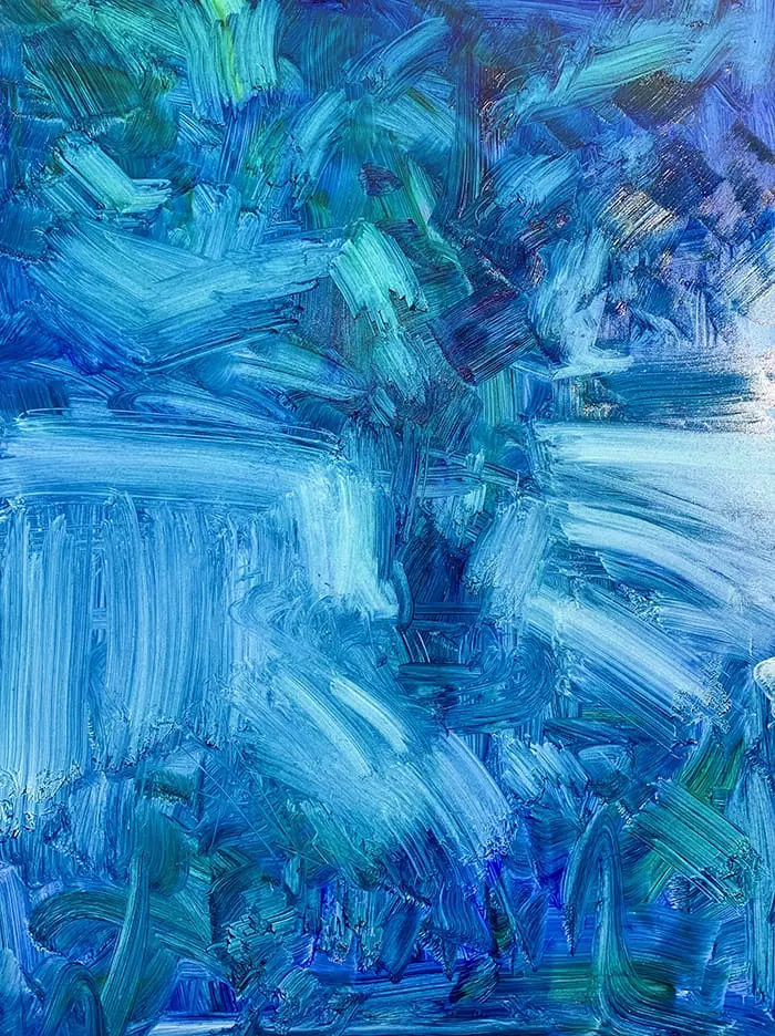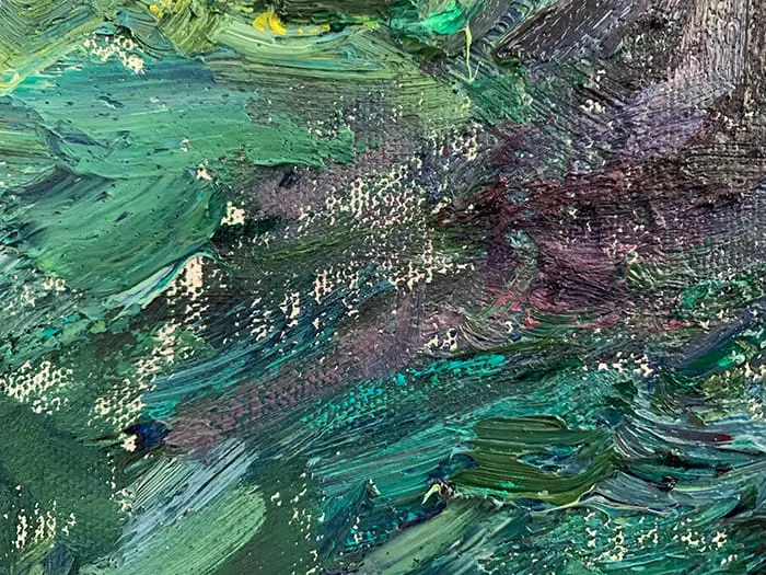 - Vous voudrez peut-être utiliser la surface blanche dans l’œuvre finie. Par exemple, vous pouvez laisser des parties de la surface blanche exposées comme reflets (comme vous le faites dans la peinture à l’aquarelle). Ou vous utilisez des parties exposées de la surface blanche pour créer une finition rustique et picturale. Je l’ai fait dans ma peinture Minnippi, Vert, Contraste. Voir la peinture ci-dessous plus un gros plan. Remarquez de minuscules lacunes dans la peinture exposant la toile blanche.
