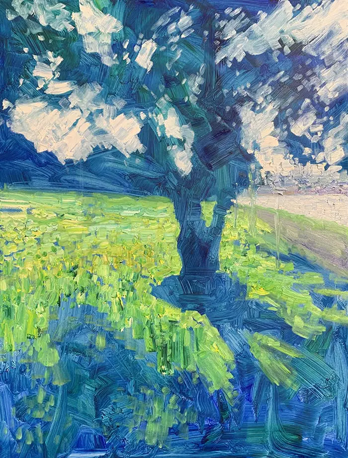 J’évite généralement les couleurs vives comme n’importe lequel des cadmiums car elles causent toutes sortes de problèmes avec votre jugement de couleur. Bien que j’aie vu certains artistes faire bon usage des couleurs vives pour la tache. Dan Schultz me vient à l’esprit. Il commence nombre de ses paysages en tachant la surface d’un rouge profond et saturé. Voir ci-dessous une peinture de son Instagram. Les résultats sont étonnants, mais j’éviterais de le faire si vous débutez.
