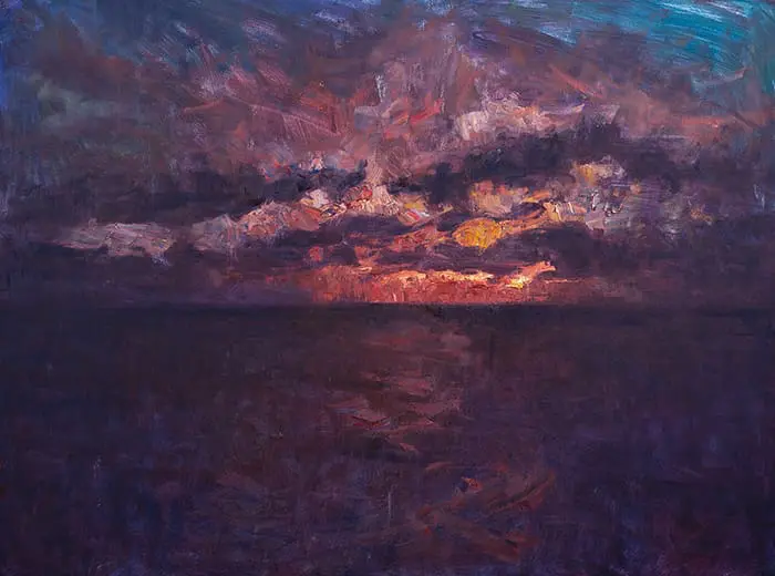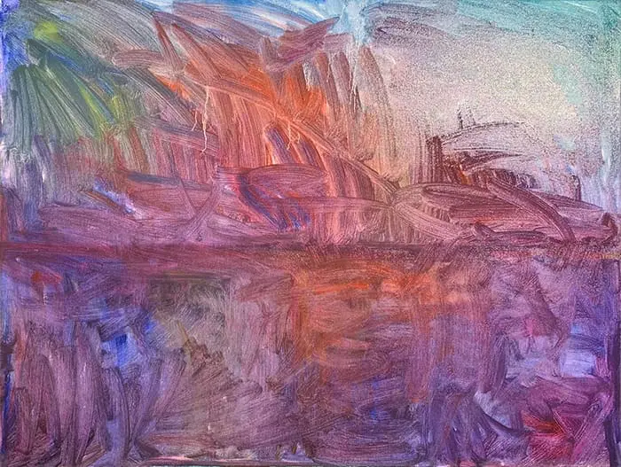 Si vous colorez la toile dans le cadre de votre thème de couleur global ou de votre stratégie pour la peinture (2), les couleurs que vous utilisez doivent s’aligner sur le reste de la peinture. Si vous peignez une forêt avec des verts et des jaunes succulents, vous pouvez tacher la toile avec un bleu riche (cela jouerait bien avec les verts et les jaunes). Si vous peignez un paysage sec, vous pouvez tacher la toile avec des couleurs terre chaudes. Cela vous donnerait la possibilité de laisser des parties de la toile teintée exposées dans la peinture finie, suggérant des roches, de la terre, des brindilles, des feuilles séchées, etc. Si vous peignez un paysage marin orageux et couvert, peut-être qu’une tache de violet ou de bleu fonctionnerait bien. Si vous peignez un coucher de soleil enflammé, vous pouvez préparer le terrain avec des rouges et des violets profonds, comme je l’ai fait avec ma peinture ci-dessous.